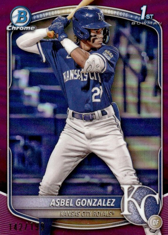 The Asbel Gonzalez 2025 Bowman #BCP-4 Chrome Prospects - Purple Wave Refractor /199 (1st) card in Raw condition has not changed in price in the last 30 days and was last sold for $2.00 .