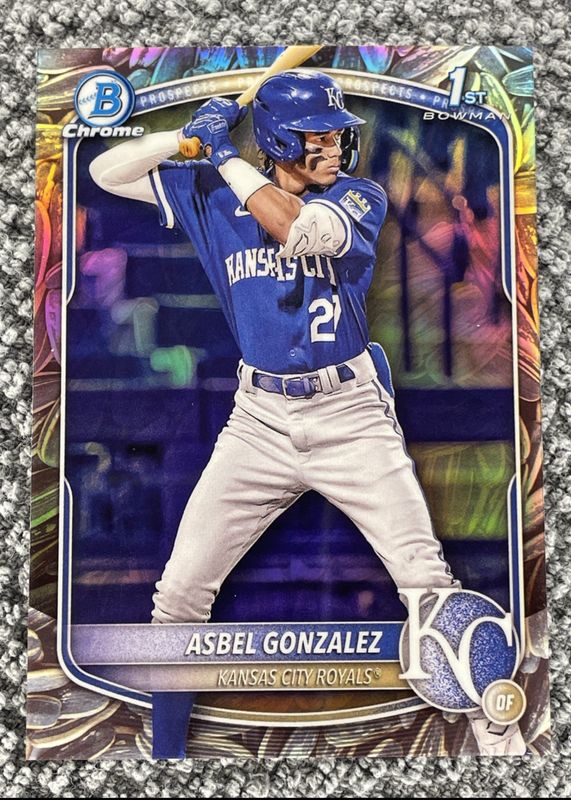 This card is 1 of 56 Asbel Gonzalez's card variations in the 2025 Bowman set being tracked by Sports Card Investor, including Chrome Prospects (1st), Chrome Prospects - Gumball Refractor (1st), Chrome Prospects - Mini Diamond Refractor (1st), Chrome Prospects - Peanuts Refractor (1st), and Chrome Prospects - Pearl Refractor (1st).