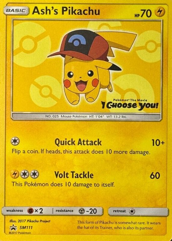 The Ash's Pikachu 2017 Sun & Moon: Black Star Promo #SM111 I Choose You! card in Raw TCG (Near Mint) condition has moved up $4.99 (+23.5%) in the last 30 days and was last sold for $26.23 .