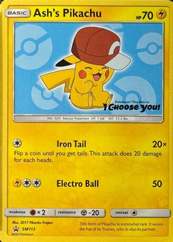 The Ash's Pikachu 2017 Sun & Moon: Black Star Promo #SM113 I Choose You! card in Raw TCG (Near Mint) condition has moved down -$1.43 (-5.0%) in the last 30 days and was last sold for $27.00 .
