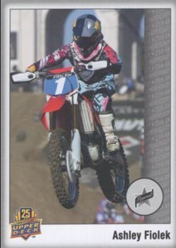 The Ashley Fiolek 2014 Upper Deck 25th Anniversary #56 Base card is 1 of 7 Ashley Fiolek's card variations in the 2014 Upper Deck 25th Anniversary set being tracked by Sports Card Investor, including Silver Celebration /250, Printing Plates Black /1, Printing Plates Cyan /1, Printing Plates Magenta /1, and Printing Plates Yellow /1.