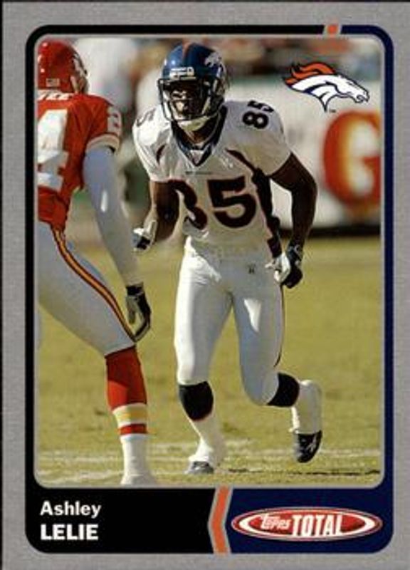 The Ashley Lelie 2003 Topps Total #74 Silver card is 1 of 2 Ashley Lelie's card variations in the 2003 Topps Total set being tracked by Sports Card Investor, including Base.