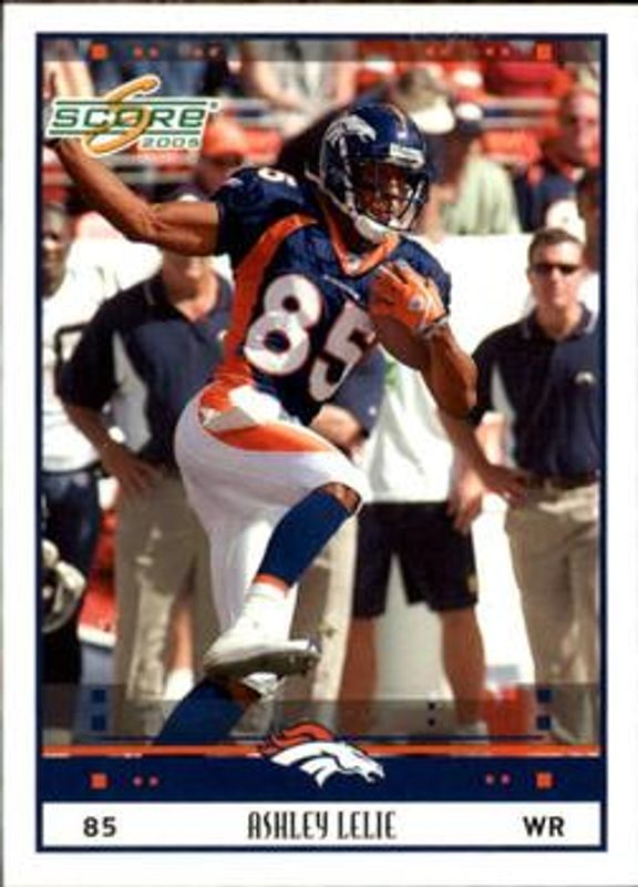 The Ashley Lelie 2005 Score #82 Base card is 1 of 6 Ashley Lelie's card variations in the 2005 Score set being tracked by Sports Card Investor, including Glossy, Scorecard /599, Adrenaline /399, Revolution /199, and Final Score /17.