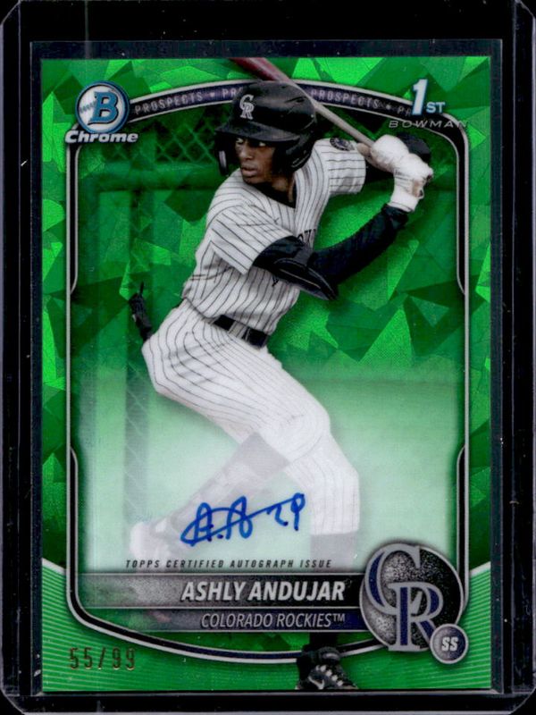 The Ashly Andujar 2025 Bowman Sapphire Edition #CPS-AA Chrome Prospect Autographs - Green Refractor /99 card is 1 of 16 Ashly Andujar's card variations in the 2025 Bowman Sapphire Edition set being tracked by Sports Card Investor, including Chrome Prospects, Chrome Prospect Autographs /199, Chrome Prospects - Green Refractor /99, Chrome Prospects - Yellow Refractor /75, and Chrome Prospect Autographs - Gold Refractor /50.