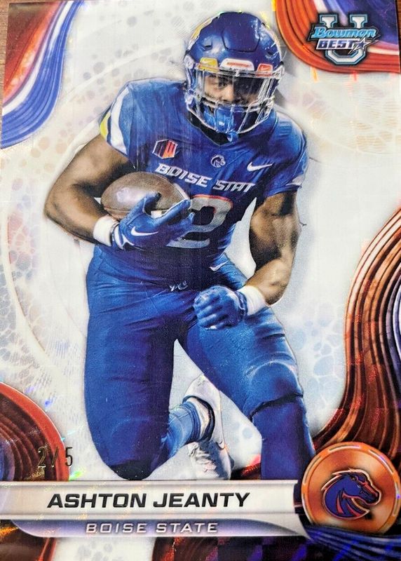 This card is 1 of 35 Ashton Jeanty's card variations in the 2024 Bowman Best University set being tracked by Sports Card Investor, including Base, Refractor, Speckle Refractor, Aqua Refractor /225, and Blue Refractor /149.