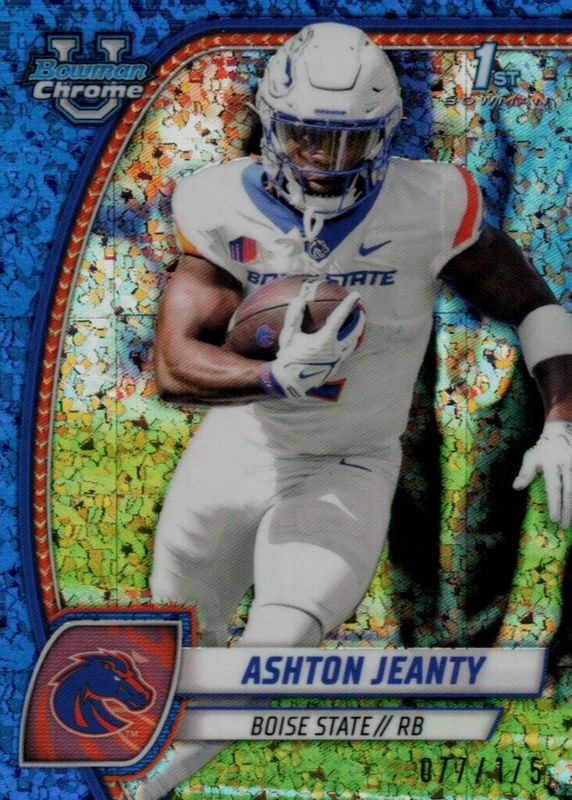 This card is 1 of 43 Ashton Jeanty's card variations in the 2024 Bowman Chrome University set being tracked by Sports Card Investor, including Base (1st), Pink Lava Refractor (1st), Purple Shimmer Refractor (1st), Refractor (1st), and Stealth Refractor (1st).