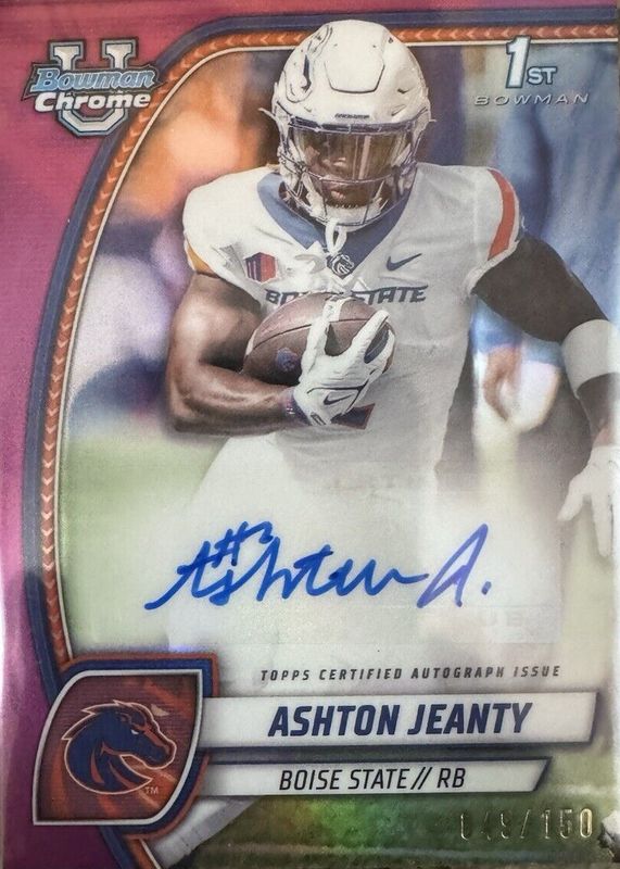The Ashton Jeanty 2024 Bowman Chrome University #PA-AJE Prospect Auto - Fuchsia Refractor /150 (1st) card in Raw condition has not changed in price in the last 30 days and was last sold for $81.00 .