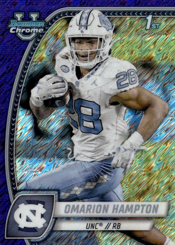Other popular players in the 2024 Bowman Chrome University set include Drew Allar, Trevor Etienne, Carson Beck, Jackson Arnold, and Cam Skattebo.