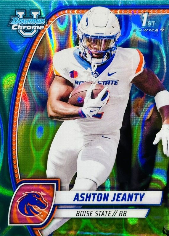 The Ashton Jeanty 2024 Bowman Chrome University #17 Teal Lava Refractor (1st) card in Raw condition has moved up $6.75 (+208%) in the last 30 days and was last sold for $10.00 .
