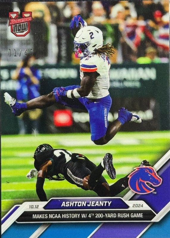 This card is 1 of 62 Ashton Jeanty's card variations in the 2024 Bowman U Now set being tracked by Sports Card Investor, including Base (Print Run: 1,991), Base (Print Run: 1,874), Base (Print Run: 1,990), Base (Print Run: 1,042), and Base (Print Run: 1,414).