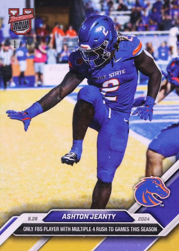This card is 1 of 62 Ashton Jeanty's card variations in the 2024 Bowman U Now set being tracked by Sports Card Investor, including Base (Print Run: 1,991), Base (Print Run: 1,874), Base (Print Run: 1,990), Base (Print Run: 1,042), and Base (Print Run: 1,414).