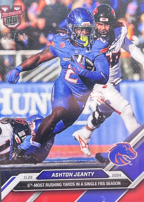 This card is 1 of 62 Ashton Jeanty's card variations in the 2024 Bowman U Now set being tracked by Sports Card Investor, including Base (Print Run: 1,991), Base (Print Run: 1,874), Base (Print Run: 1,990), Base (Print Run: 1,042), and Base (Print Run: 1,414).