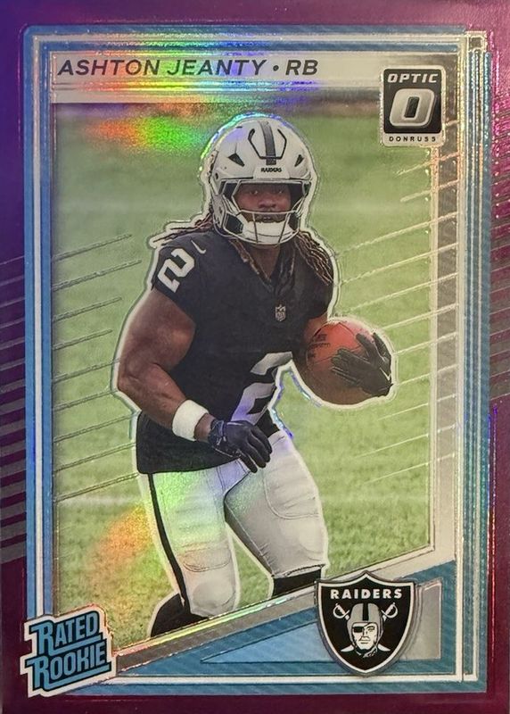 The Ashton Jeanty 2025 Donruss #305 Optic Preview - Purple /50 Rookie card in Raw condition has not changed in price in the last 30 days and was last sold for $36.50 .
