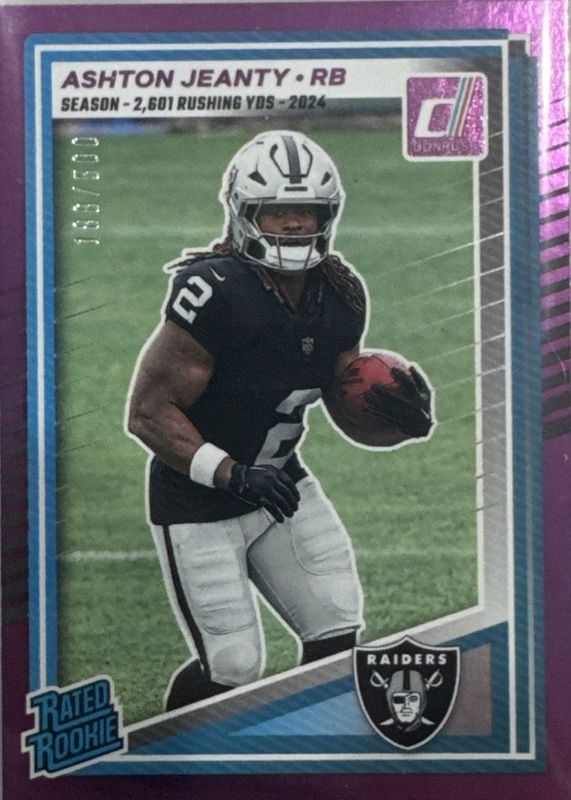 ASHTON JEANTY 2025 DONRUSS RATED ROOKIE SEASON STAT LINE RAIDERS /500 Q4832