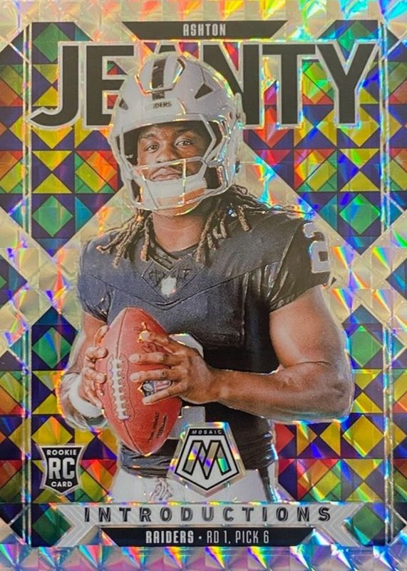 The Ashton Jeanty 2025 Mosaic #3 Introductions - Mosaic Rookie card in Raw condition has moved up $8.19 (+364%) in the last 30 days and was last sold for $10.44 .