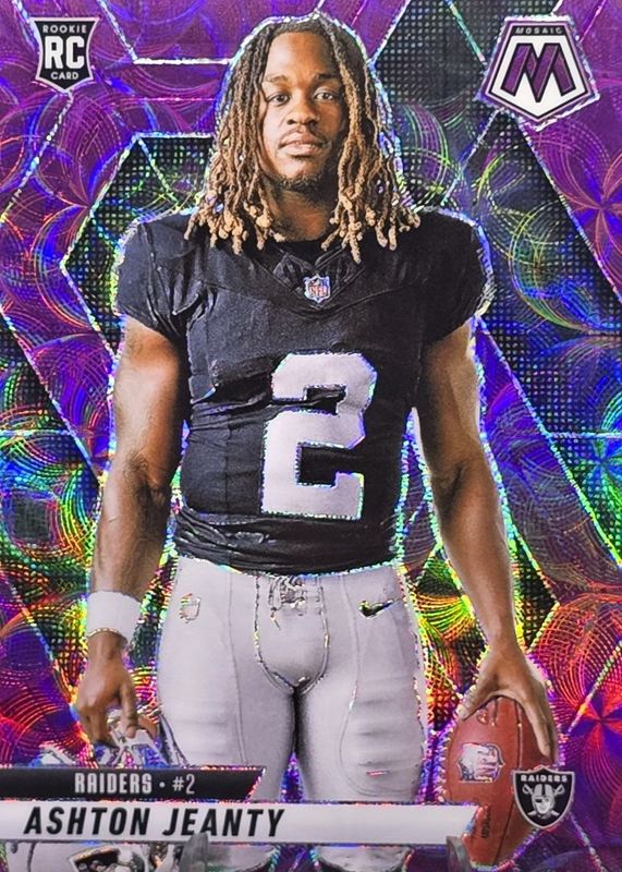 The Ashton Jeanty 2025 Mosaic #287 Rookie Variation - Purple Scope card in Raw condition has moved up $0.08 (+0.7%) in the last 30 days and was last sold for $11.41 .