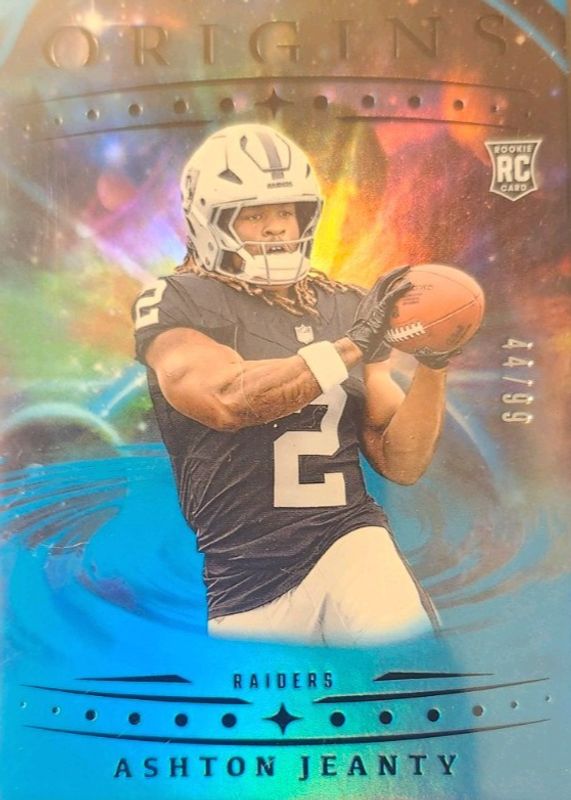 The Ashton Jeanty 2025 Origins #139 Holo Turquoise /99 Rookie card in Raw condition has not changed in price in the last 30 days and was last sold for $45.00 .