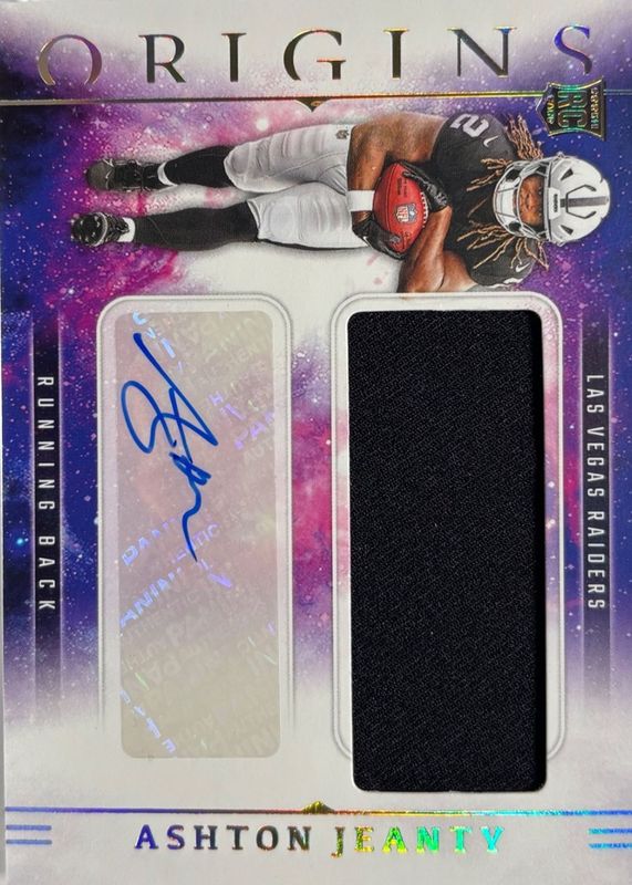 The Ashton Jeanty 2025 Origins #RJJ-AJY Rookie Jumbo Patch Autographs card in Raw condition has moved up $32.51 (+42.8%) in the last 30 days and was last sold for $108.50 .