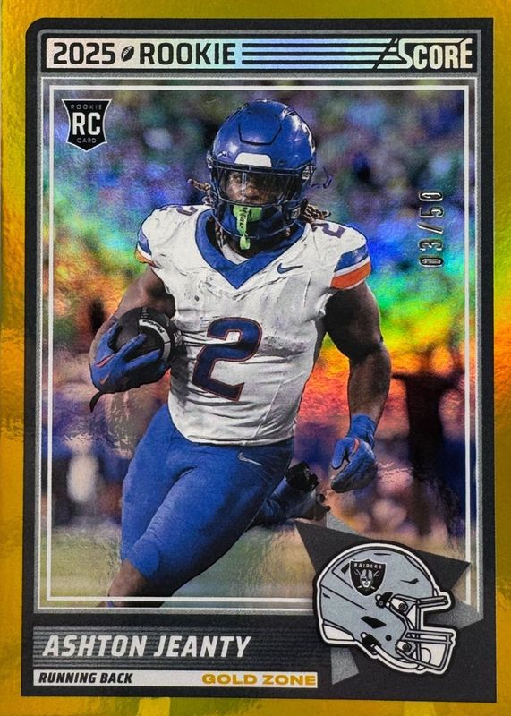 The Ashton Jeanty 2025 Score #14 Gold Zone /50 Rookie card in Raw condition has not changed in price in the last 30 days and was last sold for $79.99 .