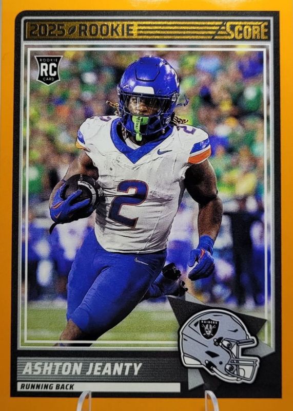 The Ashton Jeanty 2025 Score #14 Orange Rookie card in Raw condition has moved down -$0.71 (-41.8%) in the last 30 days and was last sold for $0.99 .