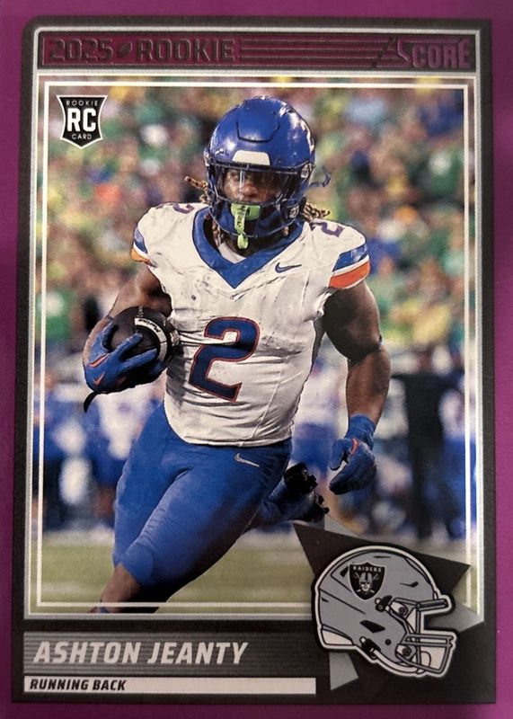 The Ashton Jeanty 2025 Score #14 Purple Rookie card in Raw condition has not changed in price in the last 30 days and was last sold for $8.00 .