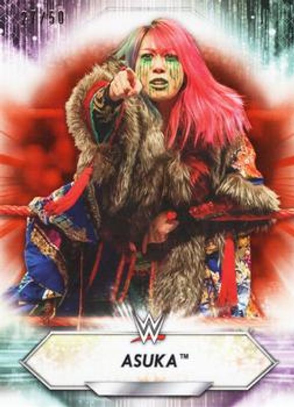 The Asuka 2021 Topps WWE #99 Orange /50 card is 1 of 34 Asuka's card variations in the 2021 Topps WWE set being tracked by Sports Card Investor, including Base, Bronze, Foilboard, Aqua /299, and Purple /25.