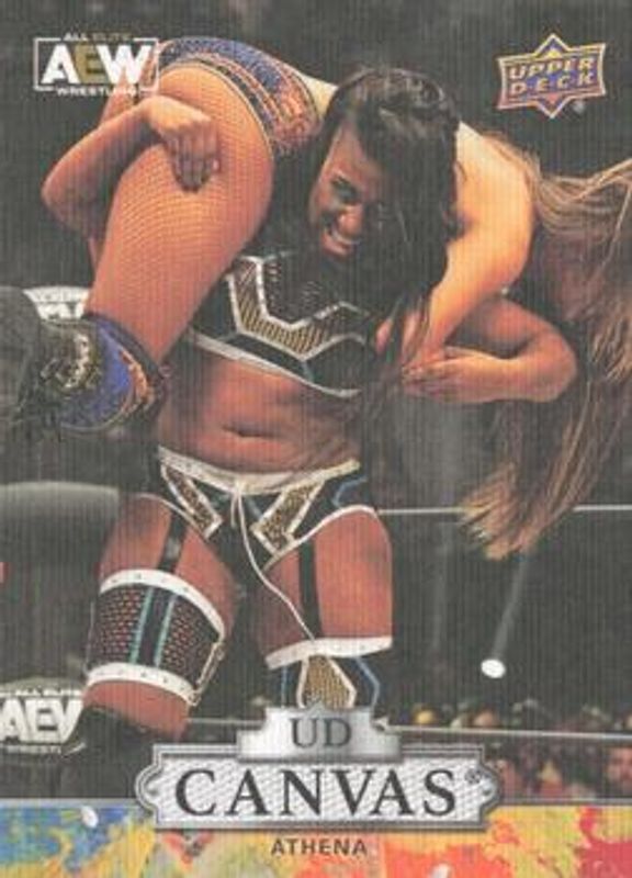 The Athena 2023 Upper Deck AEW #C90 UD Canvas card is 1 of 43 Athena's card variations in the 2023 Upper Deck AEW set being tracked by Sports Card Investor, including Base, Clear Cut, Diamond Plate, Gold, and Pyro.
