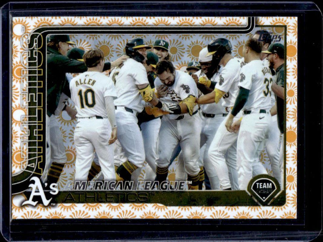 The Athletics 2025 Topps #594 Holiday Sun card is 1 of 51 Athletics' card variations in the 2025 Topps set being tracked by Sports Card Investor, including Base, Aqua Holo Foil, Diamante Foil, Holo Foil, and Pink Diamante Foil.