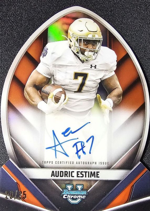 The Audric Estime 2023 Bowman Chrome University #FOFA-AE Future of Football Autographs - Orange Refractor /25 card in Raw condition has not changed in price in the last 30 days and was last sold for $129.99 .