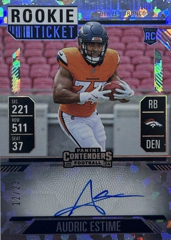 The Audric Estime 2024 Contenders #120 Rookie Ticket Auto - Cracked Ice Ticket /23 card in Raw condition has moved down -$5.01 (-25.0%) in the last 30 days and was last sold for $14.99 .