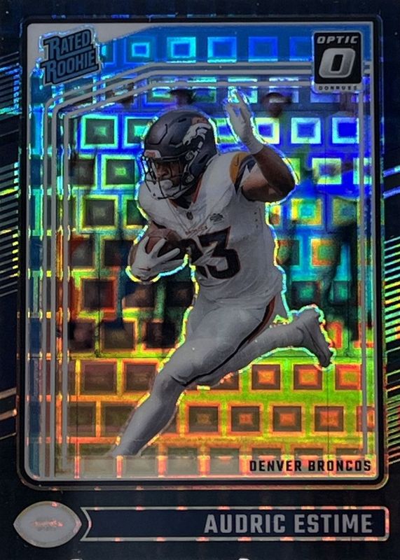 This card is 1 of 58 Audric Estime's card variations in the 2024 Optic set being tracked by Sports Card Investor, including Base, Blue Hyper, Blue Scope, Green Hyper, and Green Velocity.