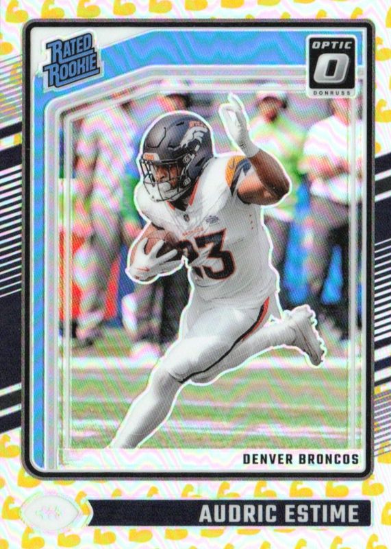 This card is 1 of 58 Audric Estime's card variations in the 2024 Optic set being tracked by Sports Card Investor, including Base, Blue Hyper, Blue Scope, Green Hyper, and Green Velocity.