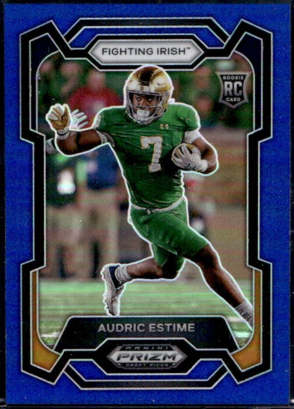 The Audric Estime 2024 Prizm Draft Picks #127 Blue /199 Rookie card is 1 of 106 Audric Estime's card variations in the 2024 Prizm Draft Picks set being tracked by Sports Card Investor, including Base, Green, Purple Wave, Red Ice, and Ruby Wave.
