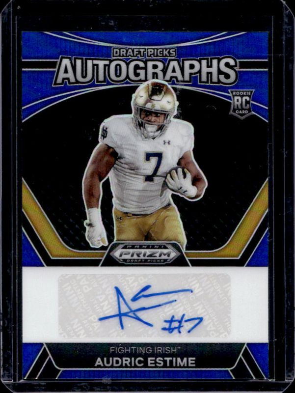The Audric Estime 2024 Prizm Draft Picks #DPA-AEE Draft Picks Autographs - Blue /149 Rookie card is 1 of 106 Audric Estime's card variations in the 2024 Prizm Draft Picks set being tracked by Sports Card Investor, including Base, Green, Purple Wave, Red Ice, and Ruby Wave.