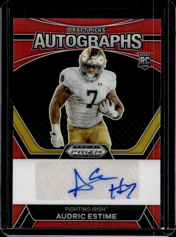 The Audric Estime 2024 Prizm Draft Picks #DPA-AEE Draft Picks Autographs - Red /199 Rookie card is 1 of 106 Audric Estime's card variations in the 2024 Prizm Draft Picks set being tracked by Sports Card Investor, including Base, Green, Purple Wave, Red Ice, and Ruby Wave.