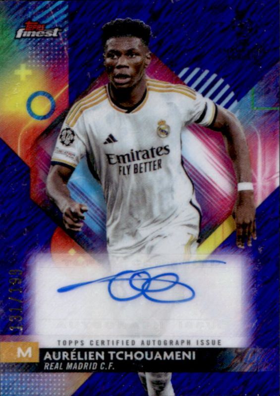 The Aurelien Tchouameni 2023 Topps Finest UEFA Club Competitions #A-TC Autographs - Purple Shimmer /199 card is 1 of 30 Aurelien Tchouameni's card variations in the 2023 Topps Finest UEFA Club Competitions set being tracked by Sports Card Investor, including Base, Refractor, Purple /299, Sky Blue /275, and Blue Aqua Vapor Wave /250.