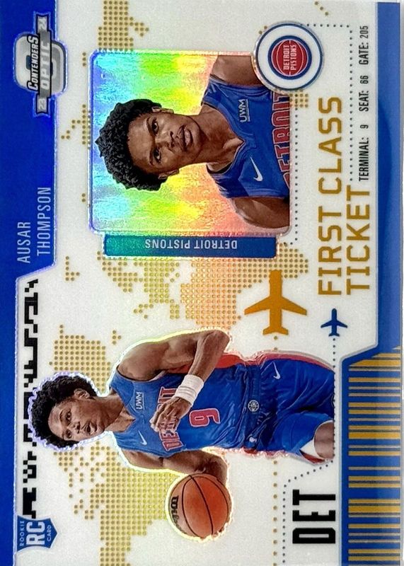 The Ausar Thompson 2023 Contenders Optic #13 First Class Ticket - Gold /10 Rookie card in Raw condition has not changed in price in the last 30 days and was last sold for $77.50 .