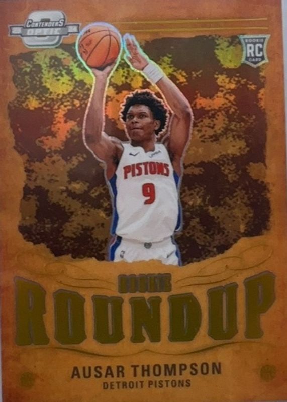The Ausar Thompson 2023 Contenders Optic #1 Rookie Roundup - Gold /10 card in Raw condition has not changed in price in the last 30 days and was last sold for $100.00 .