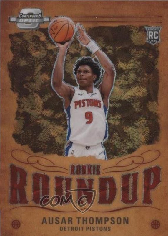 The Ausar Thompson 2023 Contenders Optic #1 Rookie Roundup - International Red card in Raw condition has not changed in price in the last 30 days and was last sold for $6.58 .