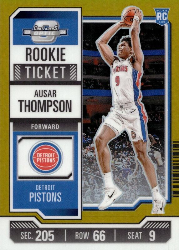 The Ausar Thompson 2023 Contenders Optic #9 Rookie Ticket - Gold /10 card in Raw condition has not changed in price in the last 30 days and was last sold for $152.50 .