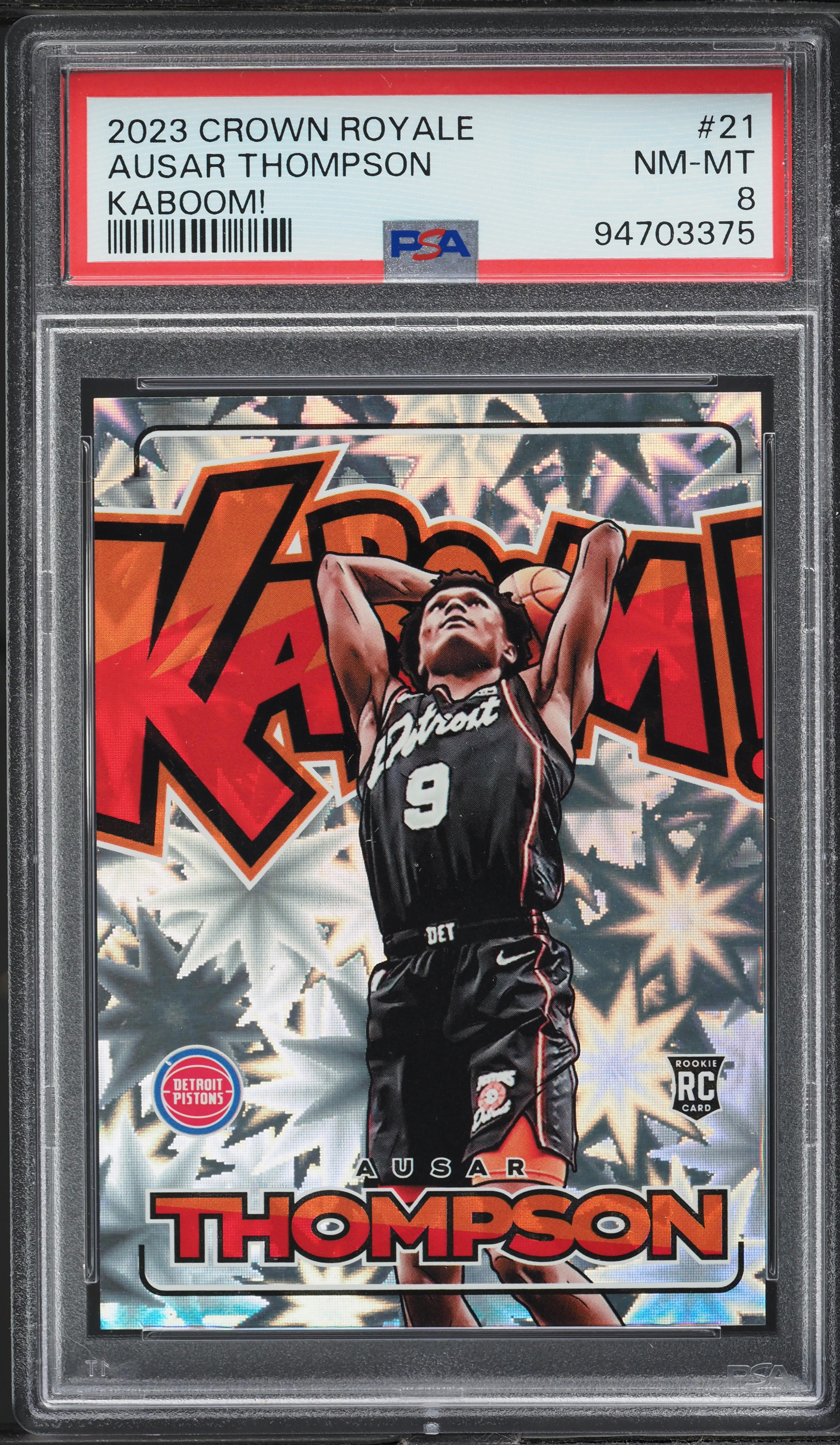 The Ausar Thompson 2023 Crown Royale #21 Kaboom! /(SSP) Rookie card in Raw condition has moved up $3.80 (+0.7%) in the last 30 days and was last sold for $540.00 .