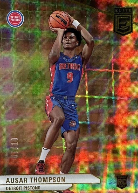 The Ausar Thompson 2023 Elite #218 International Hyper Gold /10 Rookie card in Raw condition has not changed in price in the last 30 days and was last sold for $54.00 .