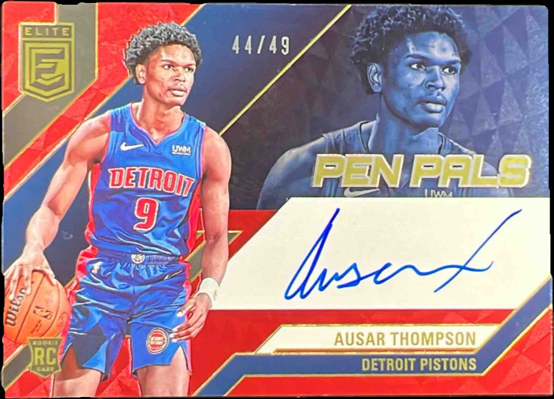 The Ausar Thompson 2023 Elite #PP-ATD Pen Pals - Red /49 Rookie card is 1 of 118 Ausar Thompson's card variations in the 2023 Elite set being tracked by Sports Card Investor, including Base, Aspirations (/91), International, International Hyper Red & Green, and Orange.