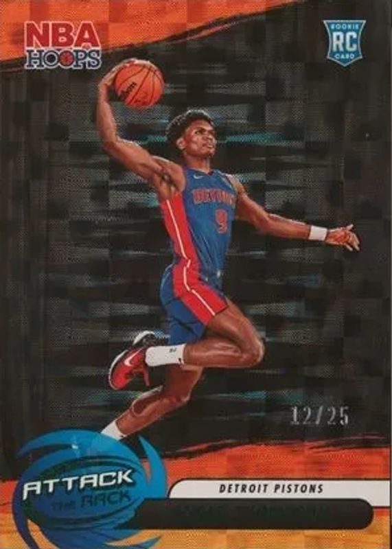 The Ausar Thompson 2023 Hoops #3 Attack the Rack - Hyper Green /25 Rookie card in Raw condition has not changed in price in the last 30 days and was last sold for $12.99 .