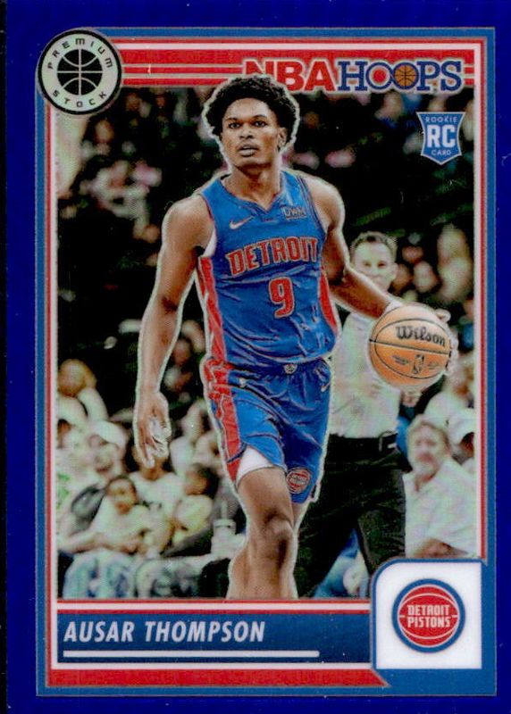 The Ausar Thompson 2023 Hoops Premium Stock #100 Blue /120 Rookie card in Raw condition has not changed in price in the last 30 days and was last sold for $9.99 .