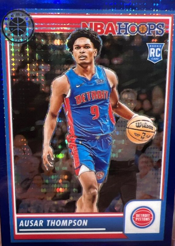 The Ausar Thompson 2023 Hoops Premium Stock #100 Blue Pulsar /75 Rookie card in Raw condition has not changed in price in the last 30 days and was last sold for $9.99 .