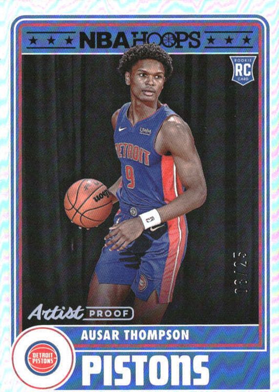 The Ausar Thompson 2023 Hoops #293 Tribute - Artist Proof /25 Rookie card in Raw condition has not changed in price in the last 30 days and was last sold for $25.00 .