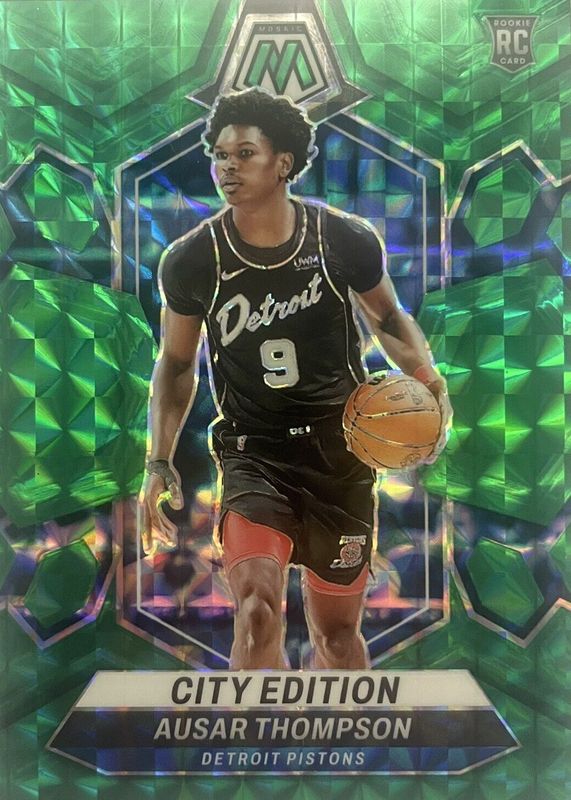 The Ausar Thompson 2023 Mosaic #290 City Edition - Choice Fusion Green /18 Rookie card in Raw condition has not changed in price in the last 30 days and was last sold for $22.50 .