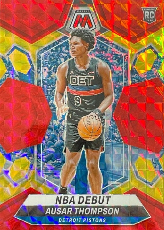 The Ausar Thompson 2023 Mosaic #262 NBA Debut - Choice Fusion Red & Yellow /75 Rookie card in Raw condition has moved down -$10.19 (-75.8%) in the last 30 days and was last sold for $3.25 .