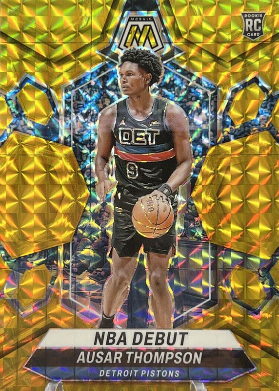 The Ausar Thompson 2023 Mosaic #262 NBA Debut - Gold /10 Rookie card in Raw condition has not changed in price in the last 30 days and was last sold for $70.00 .